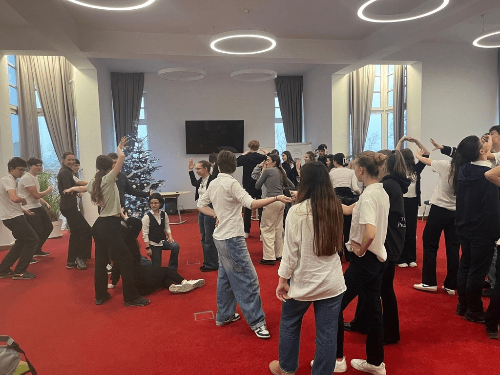 En route to the university we stopped for some food, and here in the street, Olivia Owens, our secondary tutor led us in a warmup to prepare us for the workshop. The warmup focused on physical and vocal elements, which were particularly useful considering the weather was cold and misty at roughly -3°C!